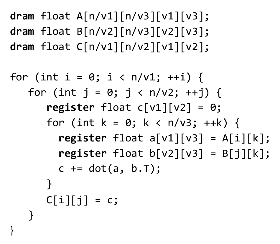 for (uint32_t i = 0; i < m / TILE; i++) { for (uint32_t j = 0; j < p / TILE; j++) { for (uint32_t k = 0; k < n / TILE; k++) { AlignedDot(a.ptr + (i * n / TILE + k) * TILE * TILE, b.ptr + (k * p / TILE + j) * TILE * TILE, out->ptr + (i * p / TILE + j) * TILE * TILE); } } } }